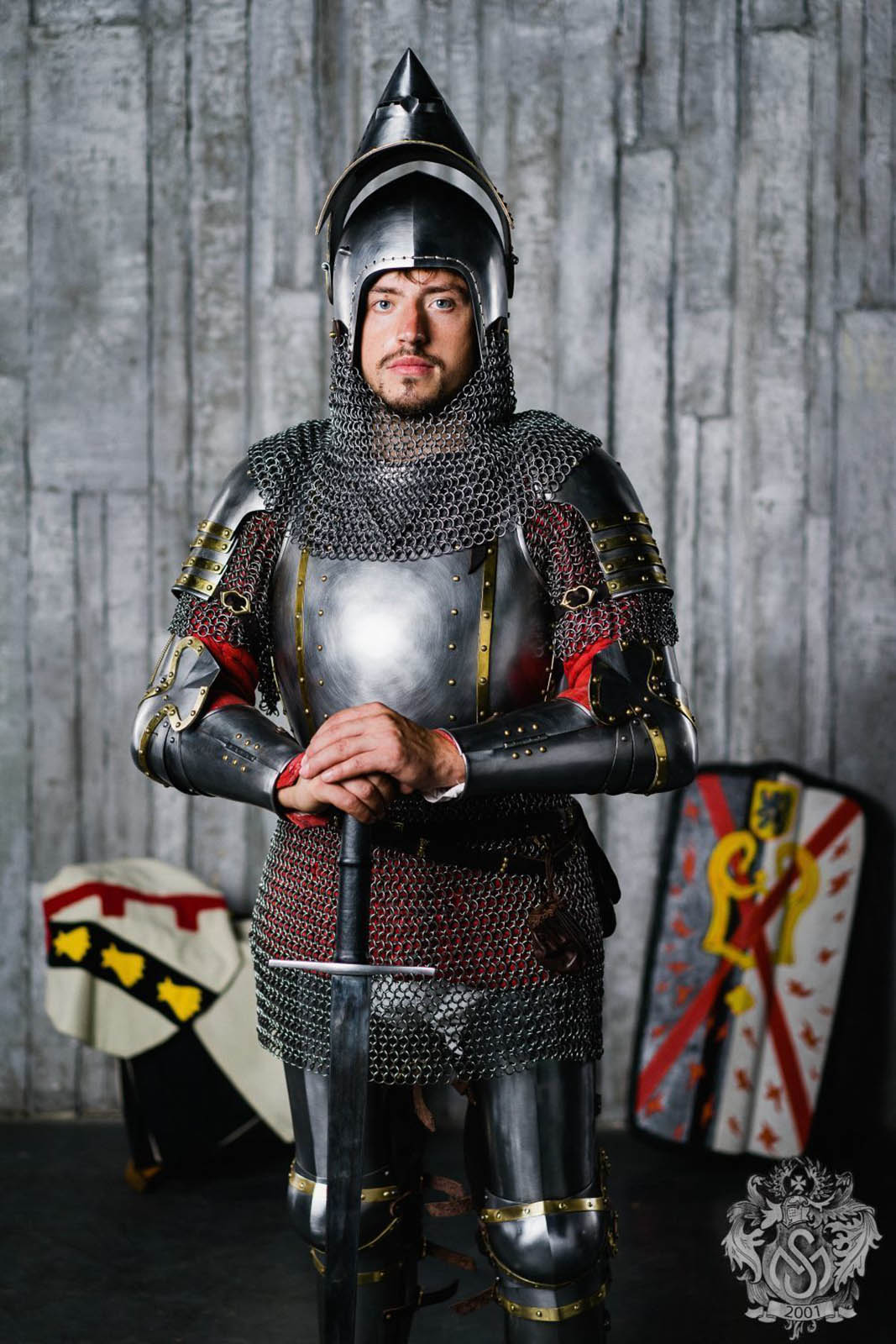 To recreate the image of a medieval knight of the XV century need to pay attention to the other elements of protection - helmets, padded linerschain mail aventails, brigandines, arm armor and leg armor. In section Suits of armor you can see all models that we offer for ordering. If you didn’t find any for your taste and wish, please send us photo and description of the required model and we will make it for you.