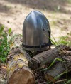Main advantage of this bascinet is a curved visor, which is not only protect a face, but completely close the chin. For better protection, we recommend to use mail aventail together with this head armor.