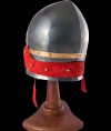 Helmet bascinet has appeared in the XIV century and was probably even more popular than Chapel-de-fer in the Western Europe and England. Metal cap cervelliere – early and simple version of basinet - was as worn under the Great Helm, so used separately. Both, noble knights and usual infantry used such type of medieval battle helmet.