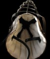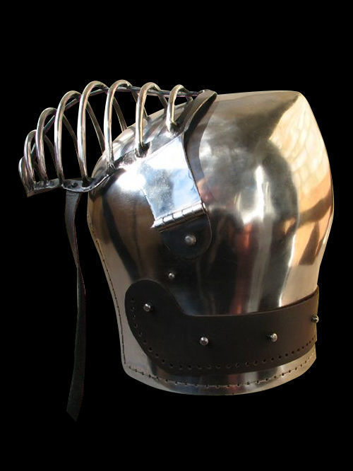 This functional steel bascinet has bar grill visor, which is attached to the dome of helmet with two side hinges. Distance between rods is 1.8-2.0 mm, that is totally compliant to SCA-standards. For additional protection of neck, throat and shoulders, we recommend to use this medieval helm with mail aventail.