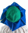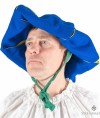 Headwear is made of wool with linen lining of contrast colour. It is tied up under the chin with fabric strap.