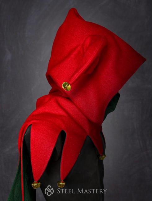 Double-sided jester's cap (wool and linen) with horns and tails. Tinky bells are sewn on the edges of shirt sleeves and tails of cap.