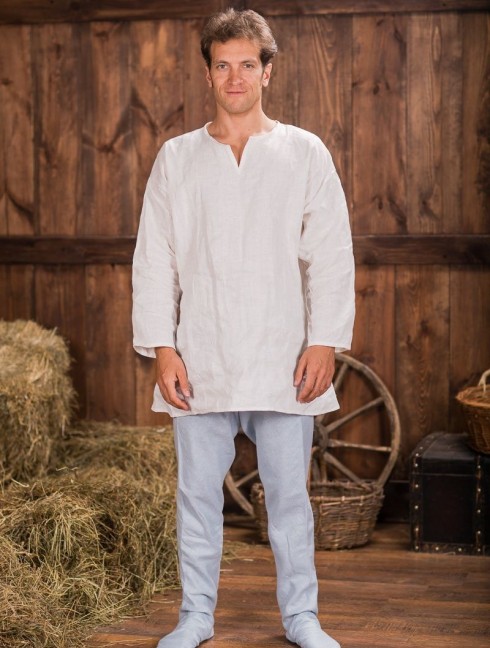 This model of chausses are being cut on the bias, that allows to make them rather tight on the legs. There are leather string on the top of the chausses, with what you can fasten chausses to the holes in braies or to the fabric belt.