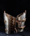 By default, splinted bracers are made of the cold-rolled steel of 1.0 mm, with firmest croupon leather for base and belts, steel rivets and buckles. You may choose type of finish treatment, metal for buckles and rivet, leather color.