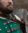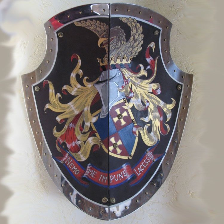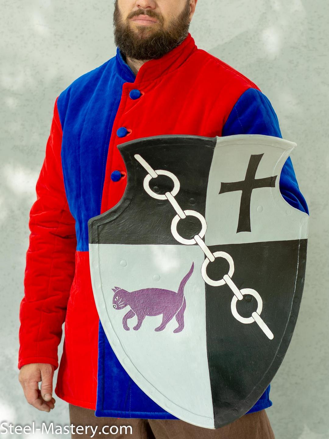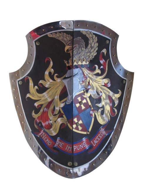 Such battle shields were usually decorated with heraldic emblem of owner. Edges are trimmed either with steel or brass strips. Leather or steel handle allow good and reliable hold of this weapon during the fight.