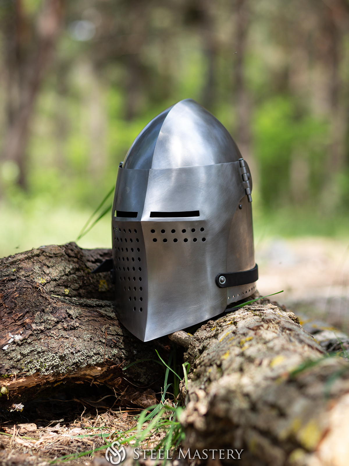 Bascinet is fastened under the chin with leather belt and buckle. Single eye slit and holes on movable visor provide with perfect vision and breathing.