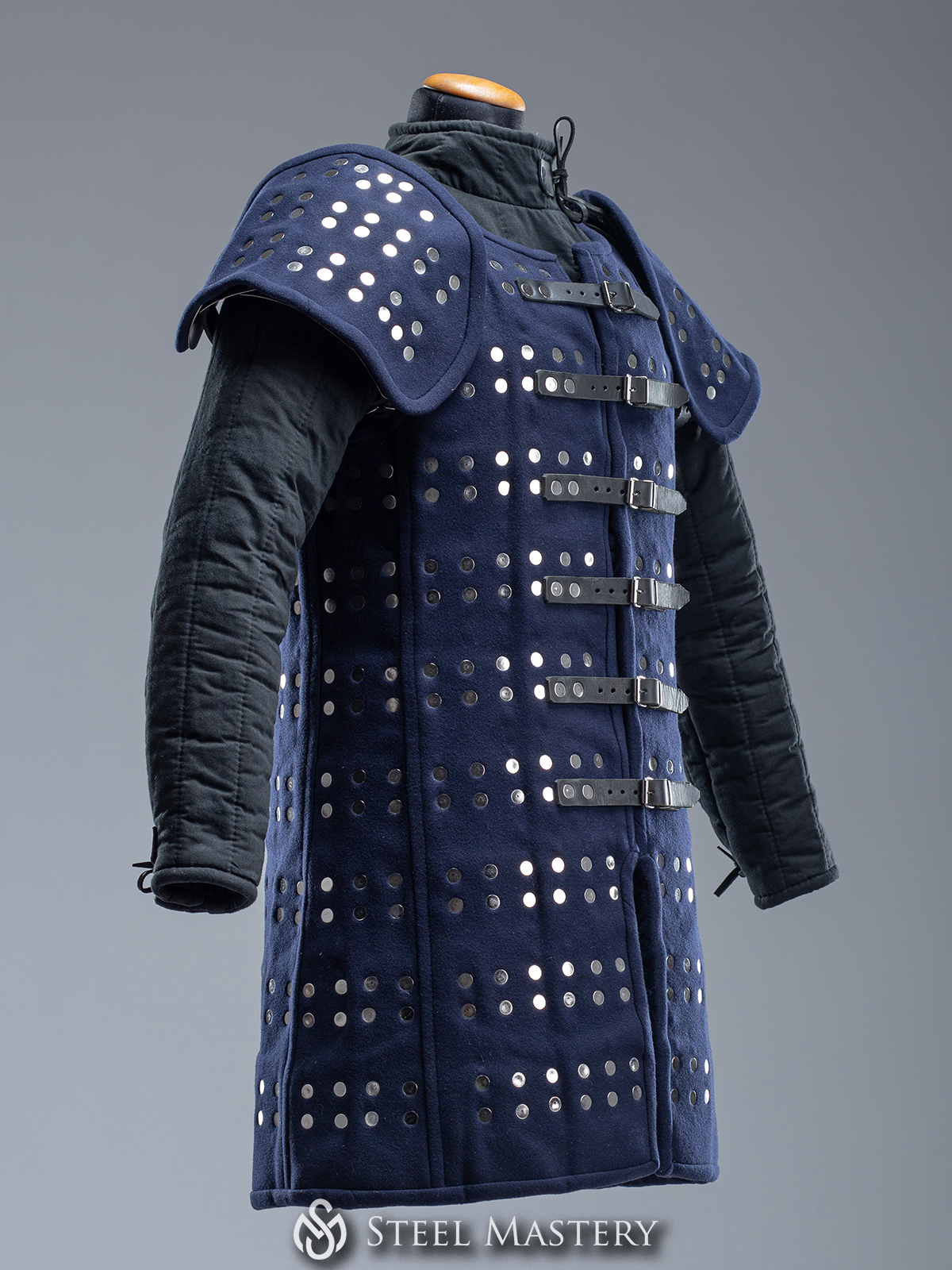 Cuts from the front and back provide with the freedom of movements. Leather belts with steel or cast bronze buckles are place from the front of this type of brigand jacket. Such position allows you easy wearoing of armor. Brigandine has cotton lining.