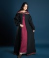 It is decorated with beautiful trim on the neckline and is fastened on the chest level.
