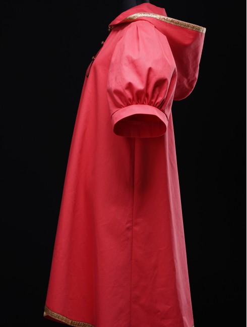 To create a gentle look model has elegant hood and short puffed sleeves. It is decorated with beautiful trim and is fastened with 7 metal buttons. Buttons can be made of brass or covered with fabric as well.