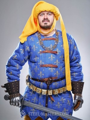 On the head of our knight, you can see a poulaine – the most fashionable headdress of those times – with a chic pelerine, thick roller, and a long tail. You can choose the color, fabric, and decoration of your chaperon. For example, decorate the edges of the cape with figured festoons as was fashionable at the end of the XIVth century.
