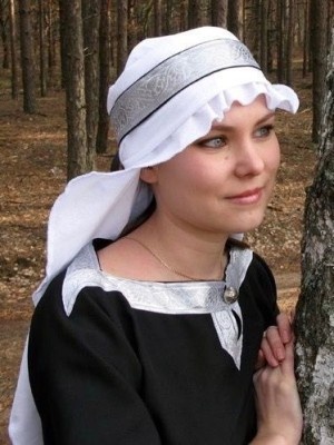 This hair covering can be made of thick white cotton or linen. Edges are trimmed with ruche.