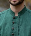 Linen shirt has decorative embroidery on neck, shoulders and wrist parts.