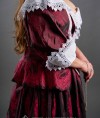 Upper/top skirt is made of luxurious embroidered wine-coloured taffeta. And the front insert (stomacher) is made of patterned brocade. Jacquard, brocade and silk were also popular as a base and additional fabric. And on request we can sew a version made of velvet or wool. You can also add a petticoat on the skirt.
