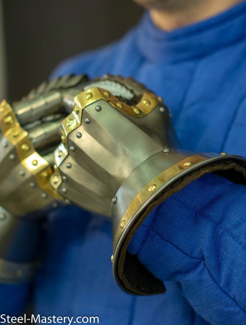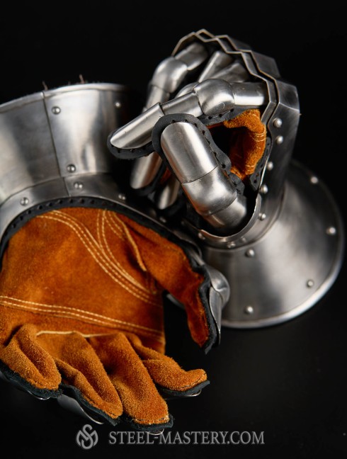 “Hourglass” gauntlets are the best choice for people, who are practicing medieval fencing. Wide wrist and thumb parts cover outer part of a hand. Such armor can be completed with articulated, brigand or scale fingers.