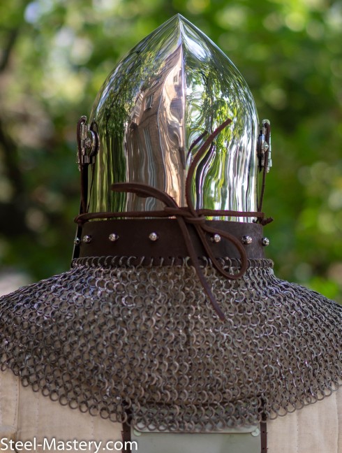 This functional armor is fastened with underchin leather belt and buckle. Medieval knights used mail and padded aventail for better protection of throat, neck and shoulders and we recommend to do the same.