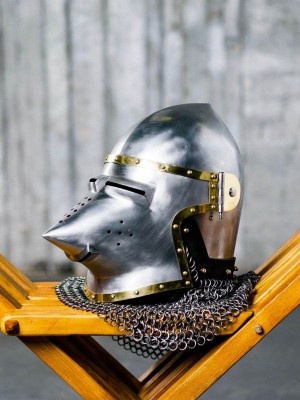 Italian sallet with visor is a typical model of that head armor. This helmet protects head and neck, but leaves the chin and lower face unprotected. Therefore, many medieval knights wore an articulated "bevor" (gorget) to complete protection and we recommend to do the same.