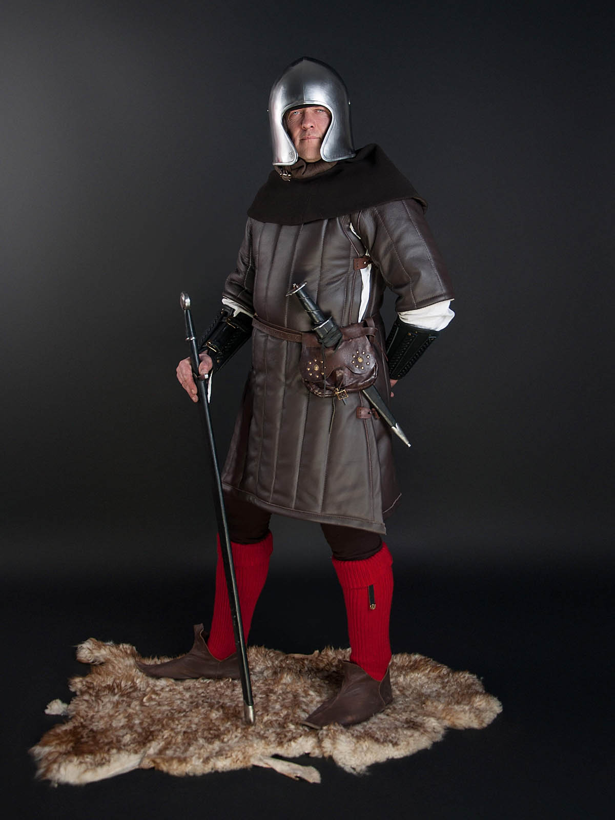 Medieval British gentlemen prefer leather gambeson. And these preferences dictated not only by aesthetic pleasure, which gives the appearance of good, well-carved leather. Leather for a medieval garment, and especially so important men’s garment as a gambison, is a guarantee of durability, reliability, and strength.