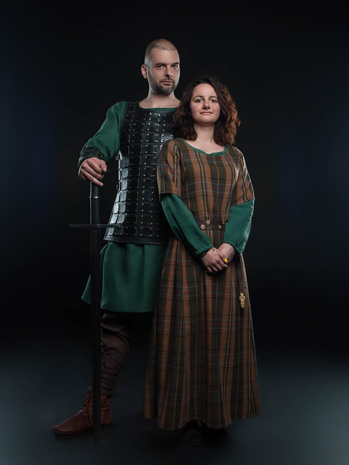 Lower dress is made of strong cotton. Long sleeves of average width are pleated at the wrists. Lacing on the back of dress allows good fitting on the figure, so look of this fancy medieval dress will glad a wearer and others. This Middle Ages dress may be worn as underdress, so independent clothing element. Depending on the chose materials, design allows becoming as medieval peasant dress, so medieval princess dress. We did not have a purpose to sew exact replica, but we get real medieval style dress by adding lacing on the backside. So, it allows “fitting” of this set to the quite wide historical period and almost any fantasy subject.