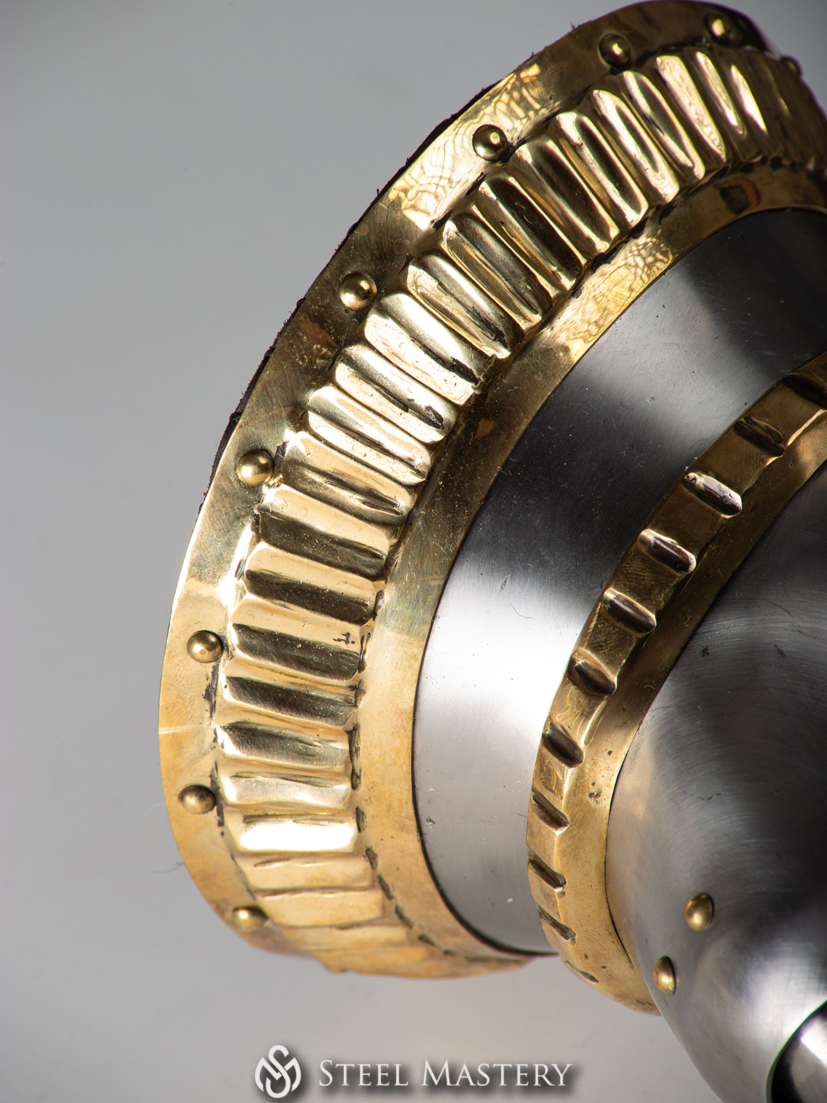 Hourglass gauntlets were made of steel and were designed to fit snugly over the hands and wrists of the wearer. They were shaped like an hourglass, with a narrow middle section that allowed for greater flexibility and movement. The gauntlets were decorated with intricate brass decoration in acorn and geometrical style.