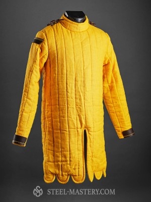 If you wish, not a basic, but a custom version of the brigantine, look closer to the model in the photo. Brigandine's cover is made of the best royal blue wool and edged with a wide strip of emerald green wool, edged with thin stripes of golden yellow. Along the hem brigandine decorated with colored flags – all details of the color decoration can be discussed. This custom version is fastened with fabulously beautiful decorative hooks, but for the combat version we recommend our standard durable leather ties.