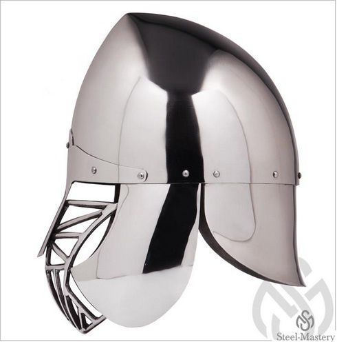 Crown of helmet is elongated and has slightly inclined top. There are nasal plate, cheek guard and neck plate from the back of helmet. Bar grill visor provides with perfect visibility and breathing during the bohurt of medieval fencing.