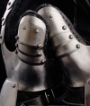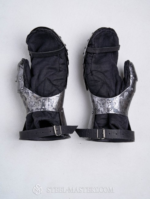 Wide metal plates allow good and firm hold of weapon without worrying about hands’ safety. Firm and soft croupon leather, belts with steel buckles, thick padded cotton mittens from the inside – that is how modern metal armor looks like.