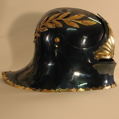 Helmet of this type replaced bascinet in the Middle Ages and became widespread among European soldiers, especially infantry. Sallets could be decorated with brass, expensive fabrics, and top figures. In most cases the sallet worn with beaver (buviger), which protected the lower part of the head and neck.