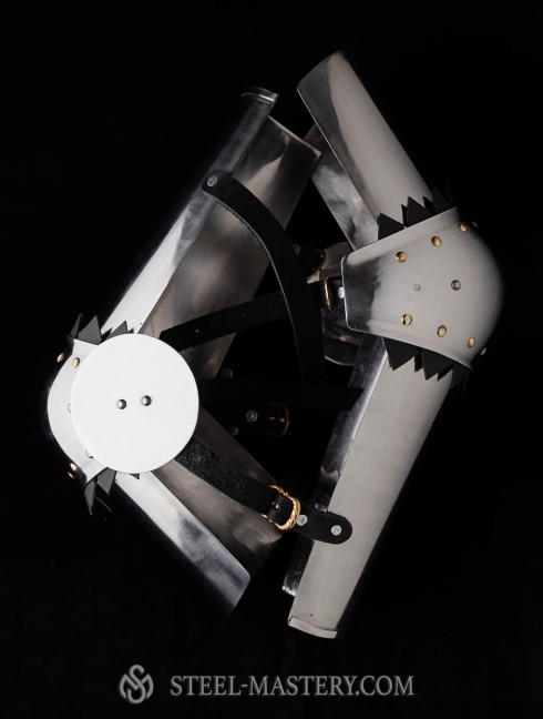 Also, defense has belts with buckles for reliable holding on the arm. There are holes on the upper part of rerebrace, so you could attach plate spaulders by your wish.
