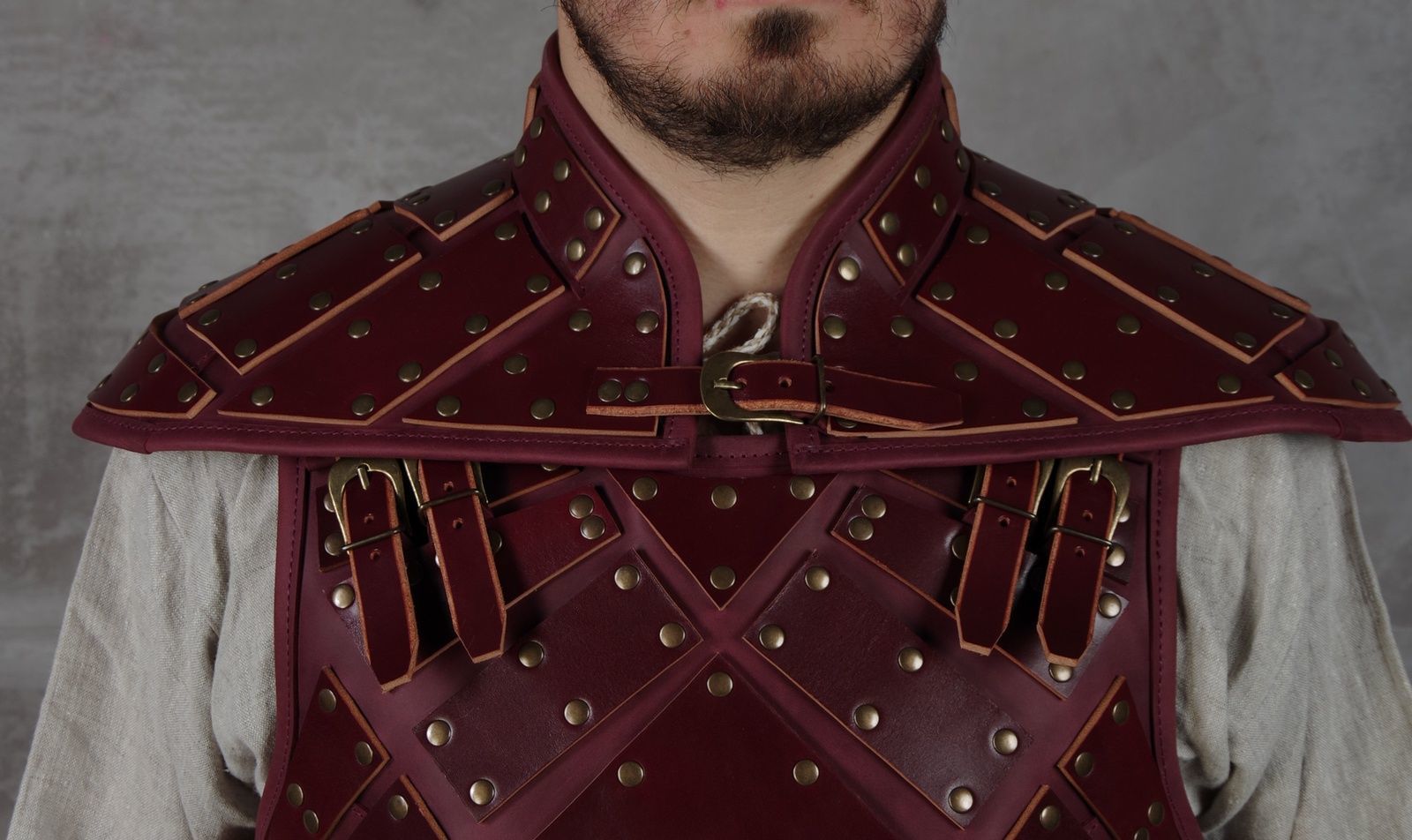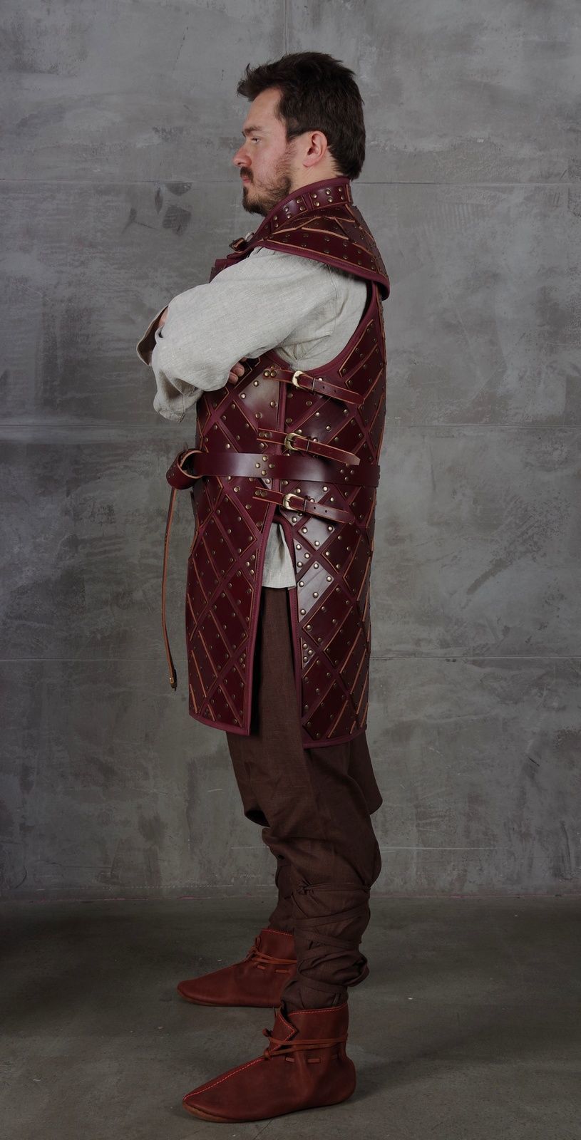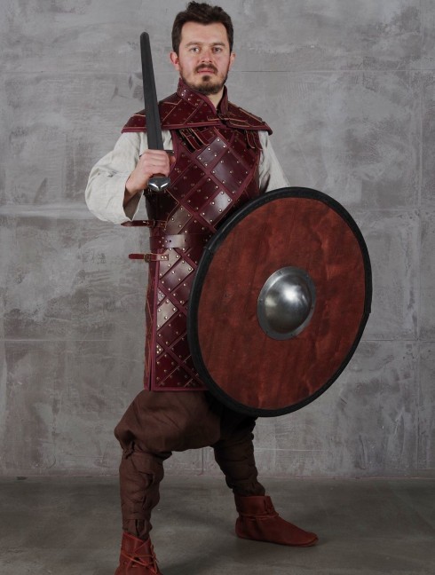 Plates are riveted to the leather base of contrast colour. Firm leather belts with buckles fix armament on your body.