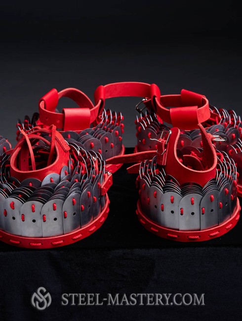 We offer reenactment lamellar armor, made of 1.0 mm polished steel plates, which are linked together with strong cord on the firm and soft leather base. Belts with steel buckles are reliable fastenings of this lamellar armor. By your wish, we may change color of leather and cord, thickness and type of metal, design and metal of buckles.
