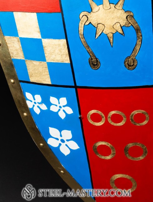 Steel shield is a model of medieval knight defense, more known as triangle or heater shield. Medieval armor of similar shape and different sizes were in wide use by infantry and cavalry starting the XII century. There are many historical sources, where you can see images of heater shield.