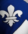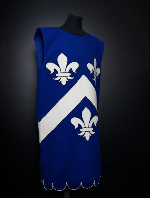 Silver and azure of this medieval tabard symbolize noblesse and generousness. Partition with chevron means protection of weaklings and striving forward. Three royal lilacs – Fleur-De-Lis – go up to devotion of Virgin Mary and hint at affiliation with royalty. That is a custom tabard with various undermeanings.