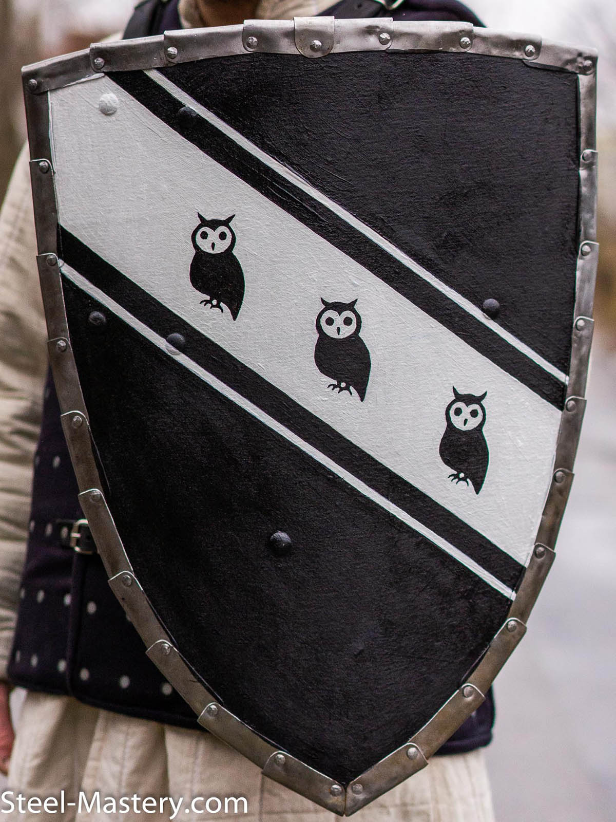 This defense was evolved from kite shield. Usually, heater shield were made of playwood, covered with fabric or leather and trimmed with metal or leather. However, quite often there were models made of steel.