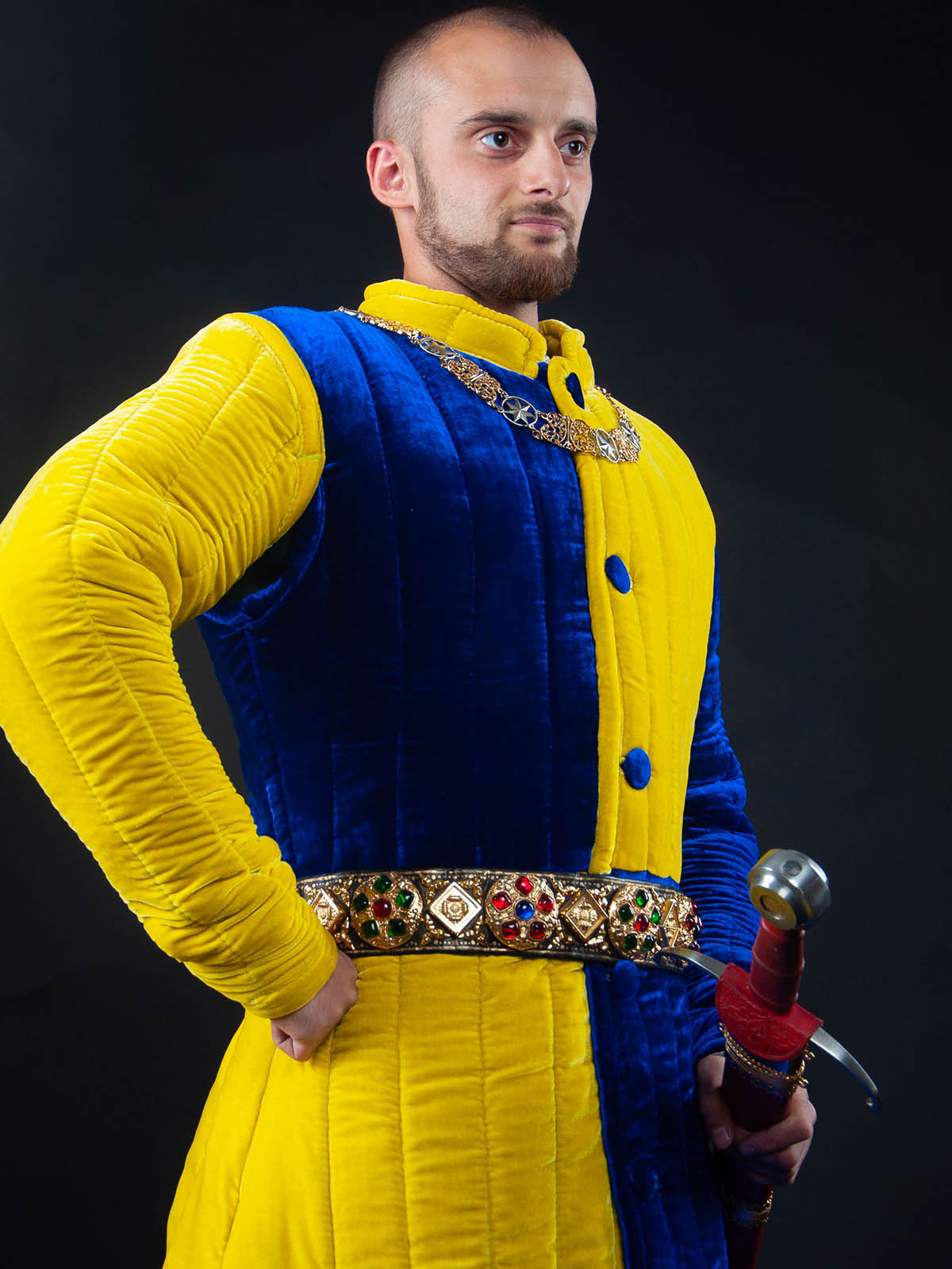 Yellow&Blue quarter colored velvet gambeson is a heraldic medieval gambison for true connoisseurs.