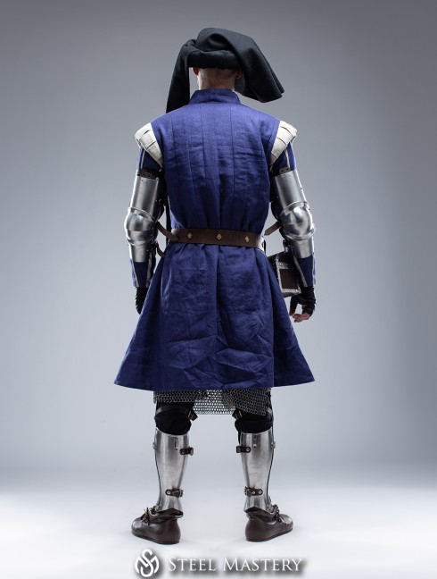 Aketon, second half of the 14th - first half of the 15th century Gambeson Steel shield buckler Plattenrüstungen Medieval cape with hood  Umhänge und Capes Vernon Roche's Blue Stripes Outfit (world of "The Witcher 3: Wild Hunt)