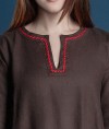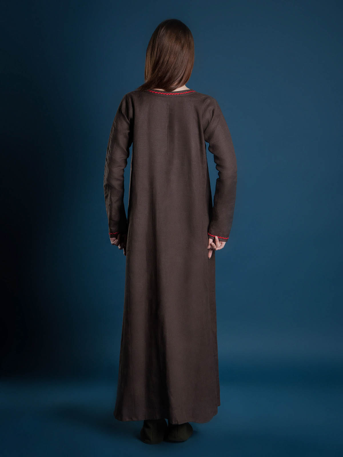 Undershirt (medieval chemise) is made of linen and decorated with hand-made embroidery around neckline and cuffs.