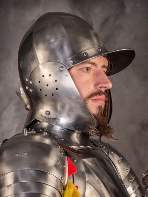 Visored sallet with bevor is a typical head armor, which was used by French knights in the XV century. Originally, sallet appeared in Italy in the Xv century. It replaced bascinet helm and gained great popularity among European warriors.