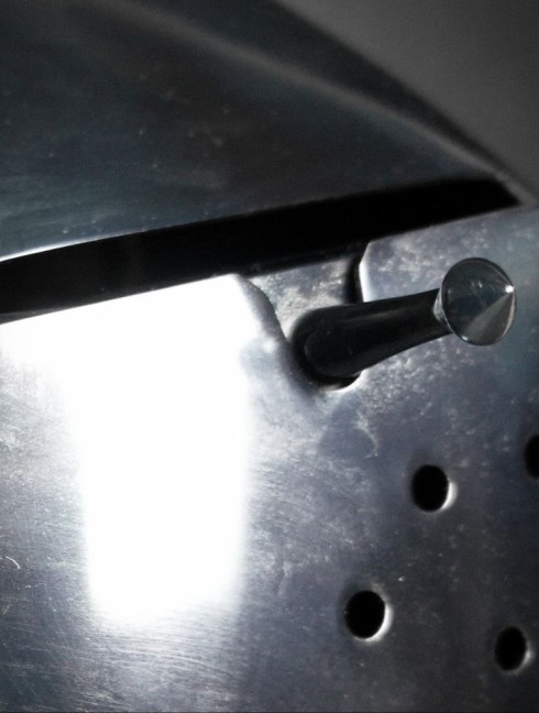 Neck is protected with movable plate gorget (bevor). Visor is fixed with push button, so you may be sure that it will not open during the fight.