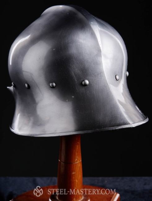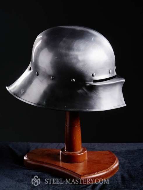 This is a copy of a sallet made by the Austrian master-gunsmith Caspar Rieder. The original dates back to 1480 and you can see it in the Metropolitan Museum of Art in New York. Earlier it was in the ancestral armory of the Counts Trapp at Churburg Castle, South Tyrol.