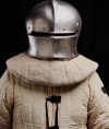 The only difference is that Caspar Rieder forged his sallet from a single piece of metal while we welded two parts of the dome together. Both helmets have a medial ridge that smoothly transitions into a low slightly flattened keel-shaped comb over the rounded bowl. Also, it has a stepped side and an outwardly turned lower edge that gradually rises to a point at the front and rear of the helmet. Helmet's crown is encircled by a row of plain iron rivets. And yes – our rivets have just the same slightly domed heads as the original one. Rivets secure a leather strap on the inside where a textile lining is stitched in place.