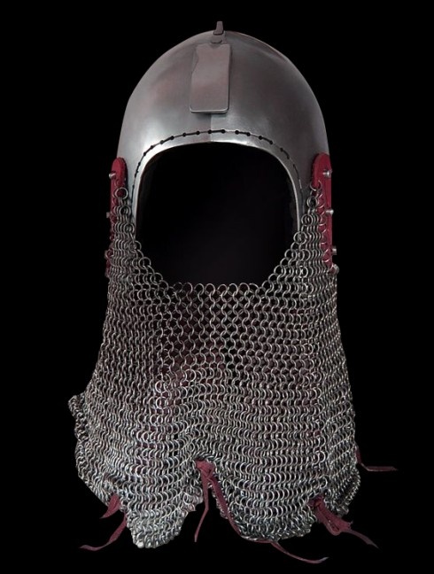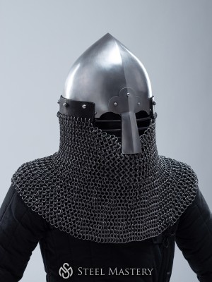 This visorless model is one of the very early bascinets. Face could be protected with padded camail and mail coif or aventail for protection of neck, shoulders and upper part of chest. You may order it separately in our store or choose it in options available for this item.