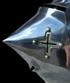 Numerous holes on visor and eye slits provide with perfect ventilation and vision. Our version of battle basinet is decorated with cross on the cheek. For better protection, such functional head armor was often completed with mail aventail.