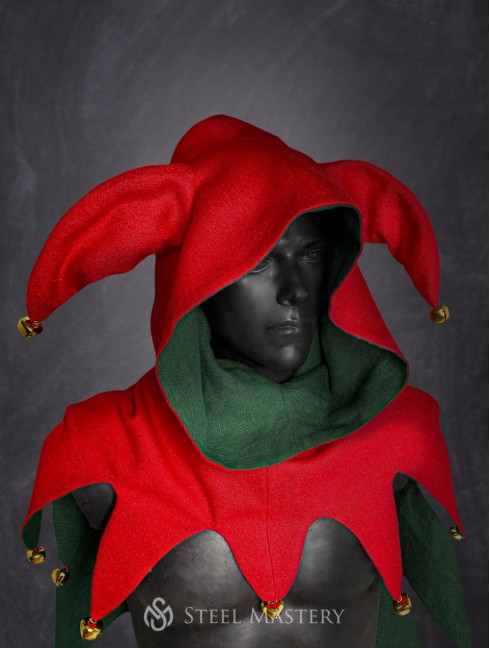 Double-sided jester's cap (wool and linen) with horns and tails. Tinky bells are sewn on the edges of shirt sleeves and tails of cap.