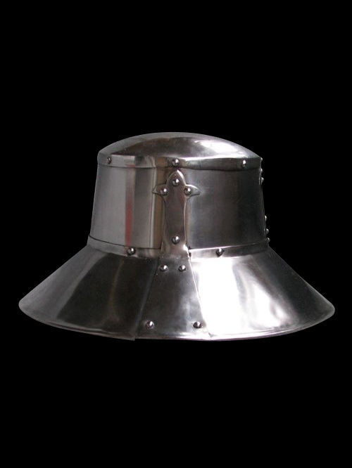 Chapel-de-Fer is a variation of medieval helmet of type Kettle hat (also known as Eisenhut, Kettle helm). This functional head protection was popular in XIII-XVI centuries among soldiers of all military branches because of simpleness of making. Despite of wide variety of models, chapel had one common feature – wide brims.