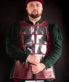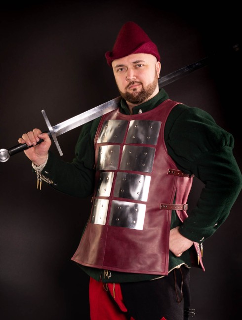We created this medieval fantasy armor especially for those who loved to read ballads since childhood and was always dreaming to become a main character there. Thin light but firm steel plates are riveted on the vest of thick and soft leather of wine-red color – 8 plates from the front and 10 on the back part. Brigantine is fastened on the sides with adjustable belts with steel buckles. Armor in LARP style absolutely does not restrict movements, allowing as doing archery and throwing the battle log, so riding and dancing. It is light and comfortable, so you may think that there is not medieval light armour is worn on you, but just a stylish jacket.