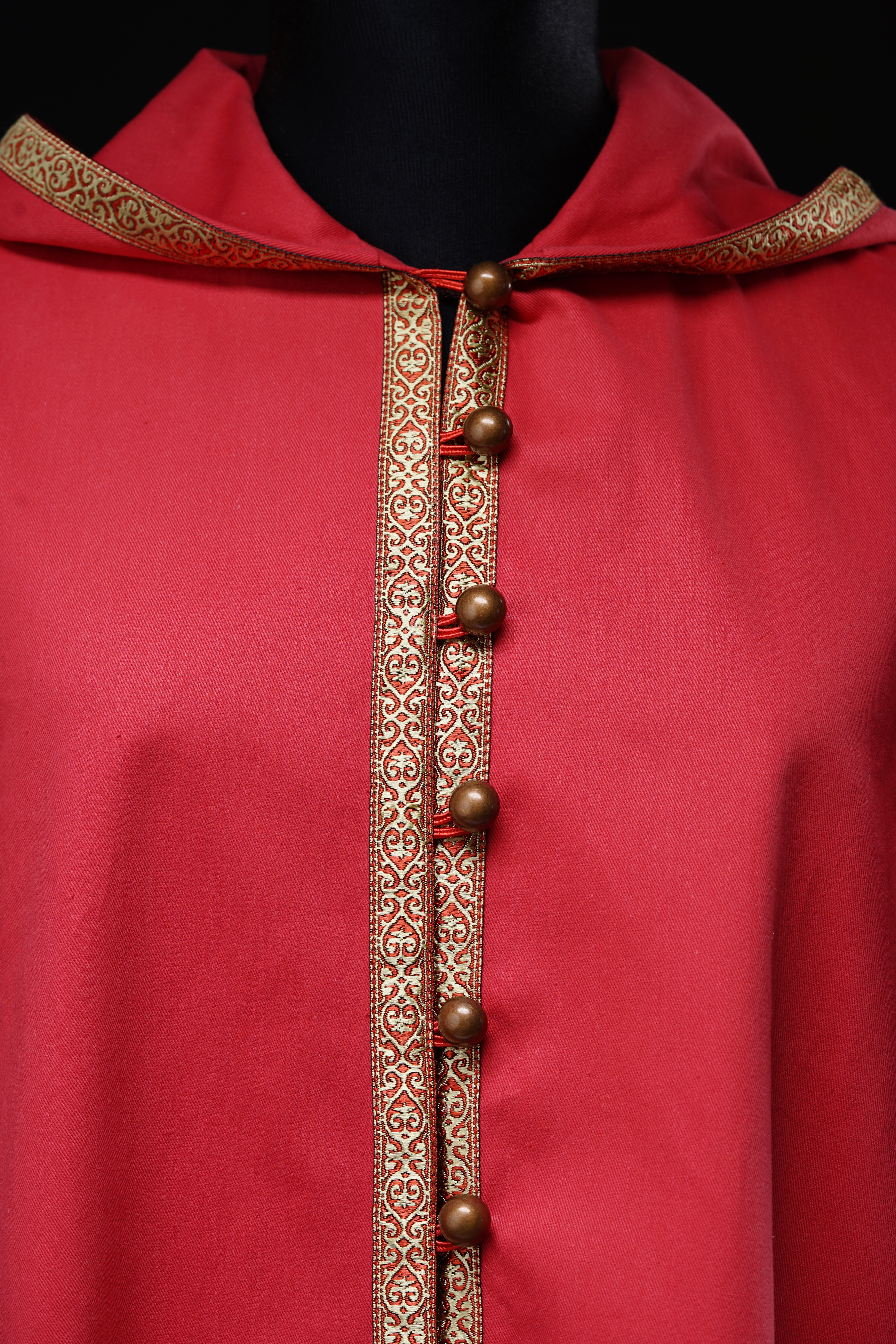 To create a gentle look model has elegant hood and short puffed sleeves. It is decorated with beautiful trim and is fastened with 7 metal buttons. Buttons can be made of brass or covered with fabric as well.