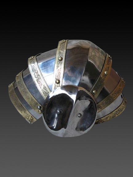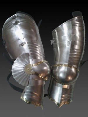 Complex knee protection is an essential element of medieval battle outfit of every knight. First models appeared in the XIII century. Kneecaps (poleyn) of various shapes were used together as with brigand or plate leg armor, so over the mail stockings. This element could be worn as independent piece of medieval leg armor, so as a part of solid metal legs (cuisse). Numerous effigies, miniatures, paintings and other historical sources show us knights, wearing such joint armor.