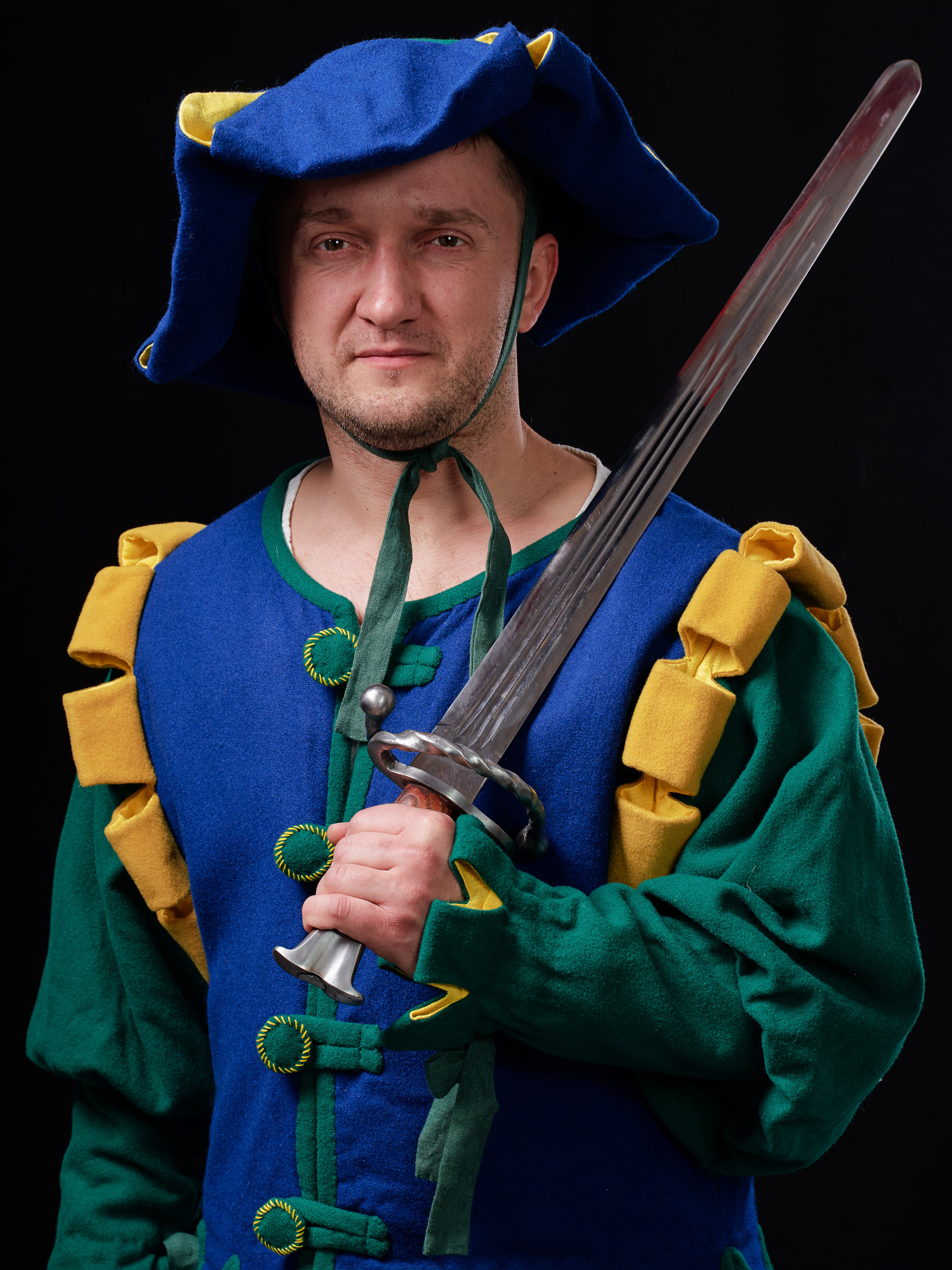 We make this costume of landsknecht, basing on the gravure of Heinrich Aldegrever “Die kleinen Hochzeitstänzer”.