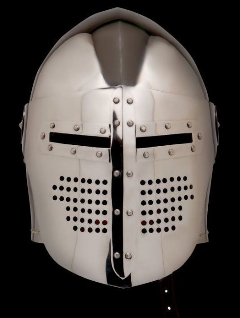 Medieval battle helmet of type bascinet was widespread among European knights in the XIV-XV centuries. This functional armor had dozens of dome and visor designs, depending on the region of using. Knights were usually completed bascinet with padded pelerine and mail aventail. That way, neck, throat, shoulders and upper part of chest were covered and well protected.