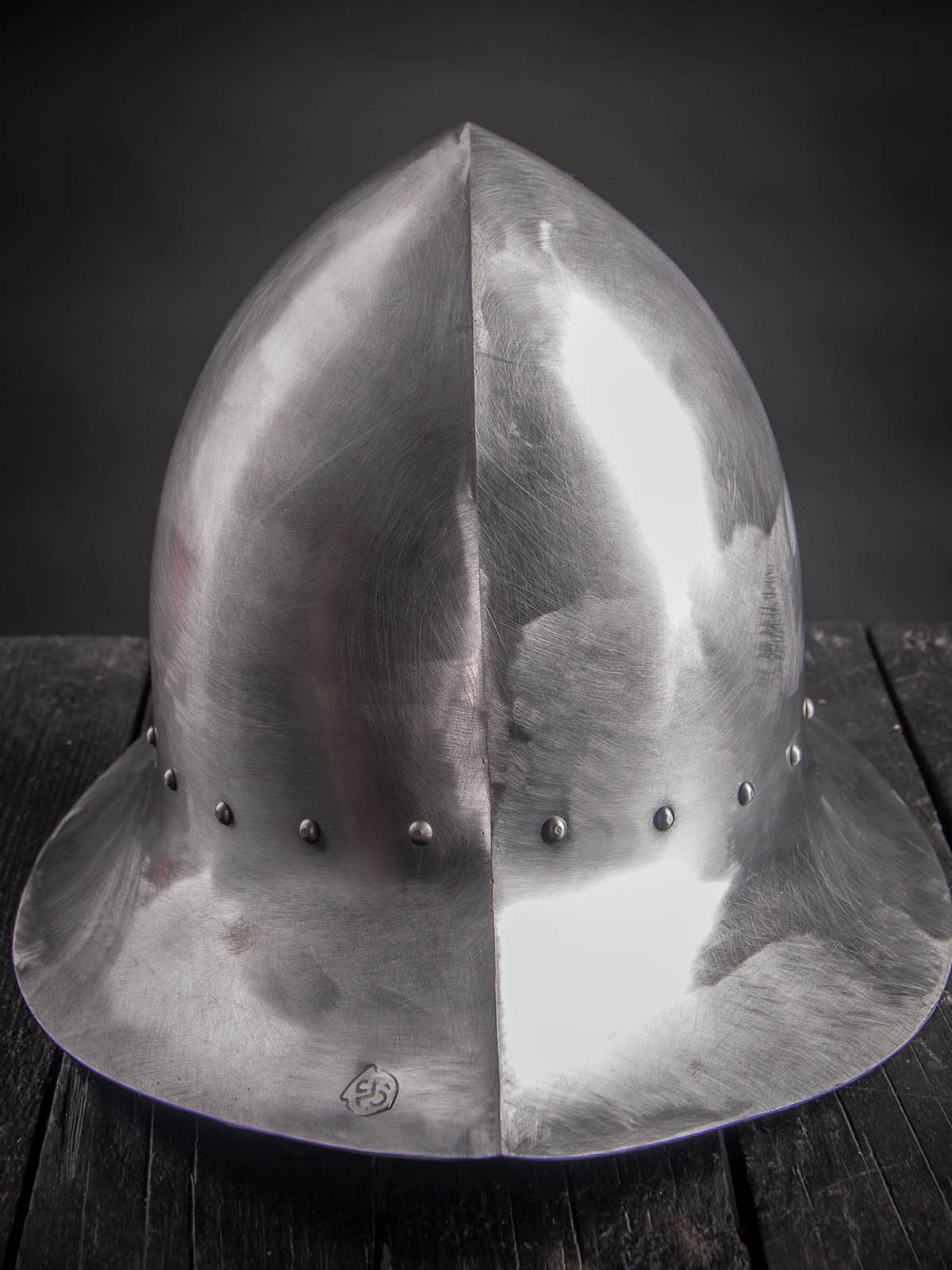 Here is a pinnacle of the French armorers’ engineering in the XV century. Yes, don’t smile and look so surprised. This “egghead” and funny medieval helmet was the best protection against the most tremendous hand-held weapon of that epoch. But, let’s talk about step by step.